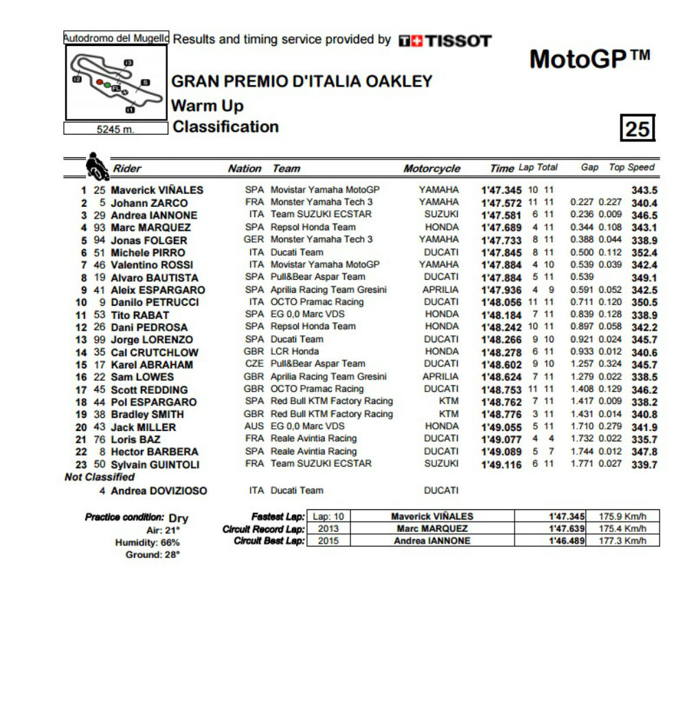 Viñales, realizou o melhor tempo no apronto final para a corrida ao rodar em 1m47,345s na sua melhor volta e batendo Johann Zarco (Monster Yamaha Tech 3), por 0,227s, enquanto Andrea Iannone (Suzuki) realizou o terceiro tempo a 0,236s de Maverick Viñales, enquanto Marc Márquez (Honda) alcançou o quarto tempo a 0,344s.