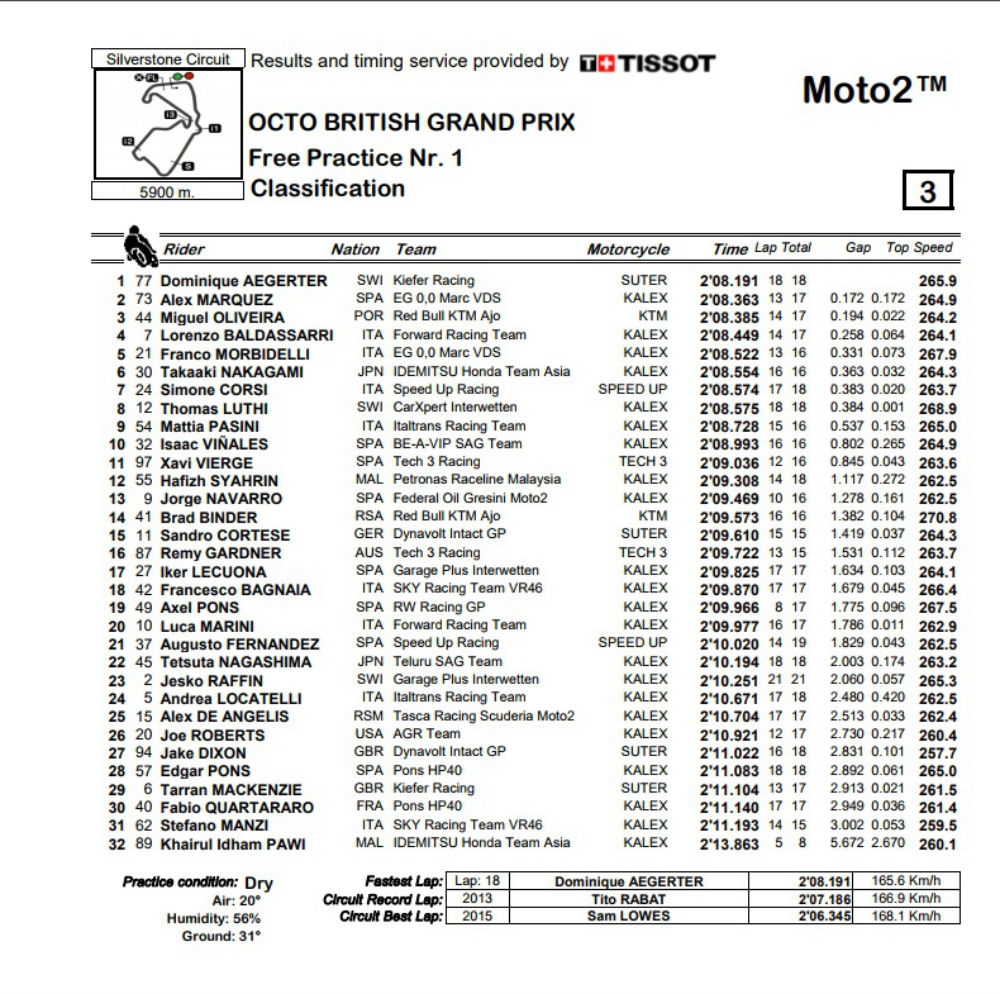 O piloto português da Red Bull KTM Ajo, começou a sessão a realizar o melhor tempo tendo rodado em 2m09,201s. Contudo Alex Márquez (EG 0,0 Marc VDS) acabou por bater o tempo do português e já no final da sessão foi a vez de Dominique Aegerter (Kiefer Racing) , bater o tempo do espanhol e terminar no topo da tabela de tempos desta primeira sessão de treinos livres, depois de ter rodado em 2m08,191s, relegando assim Alex Márquez para a segunda posição a 0,172s.