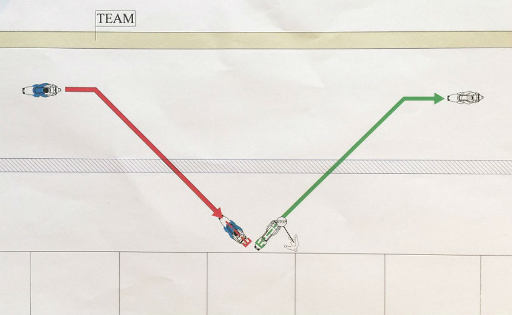 A mudança a testar conta com uma marca no chão do pit lane onde deve entrar o piloto com a moto e outra marca onde vai estar a moto com a qual o piloto vai sair (ver esquema).