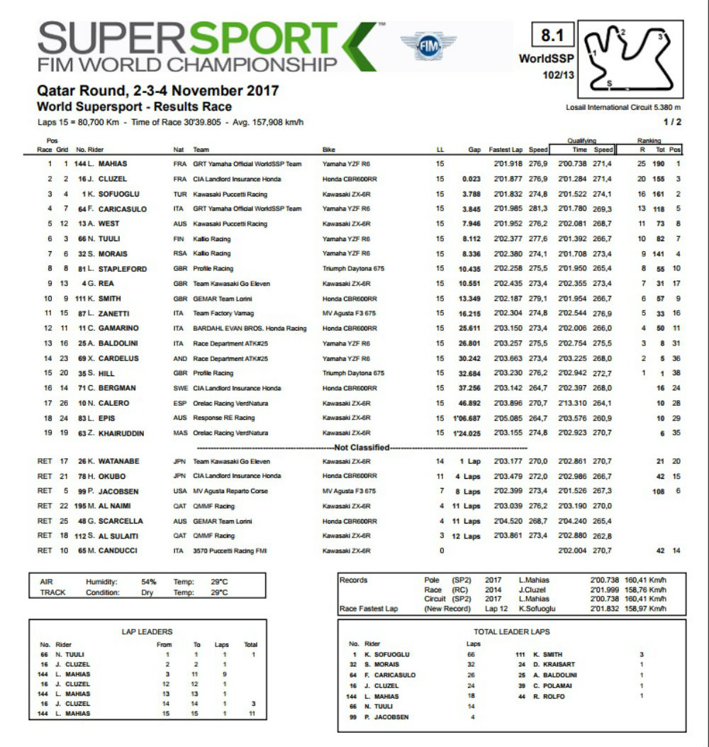 Nas contas de um campeonato, Lucas Mahias é assim campeão com 190 pontos, enquanto Kenan Sofuoglu termina como vice campeão com 161 pontos e Jules Cluzel terminou o mundial no lugar mais baixo do pódio com 155 pontos.