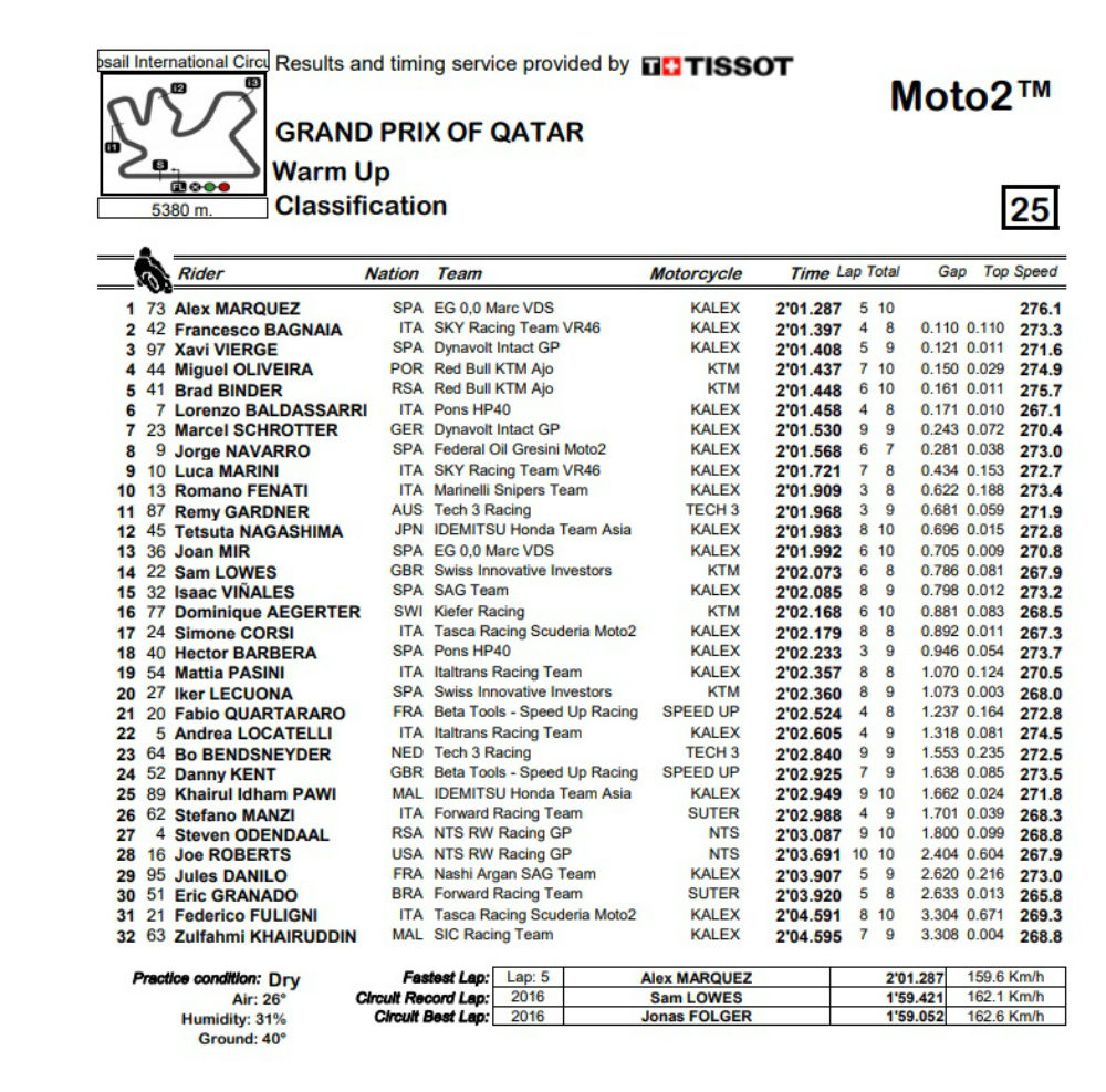 Esta concluído o teste final antes do GP do Qatar para os pilotos de Moto2, num Warm-Up onde Miguel Oliveira (Red Bull KTM Ajo), que vai sair para a primeira corrida da temporada da segunda linha da grelha de partida, realizou o quarto melhor tempo ao rodar em 2m01,437s , a 0,150s do mais rápido deste último apronto para a corrida de Losail.