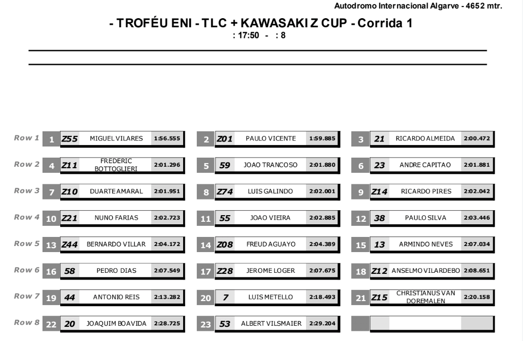 A linha da frente ocupada por M. Vilares (Z55), que faz a pole “à geral” com 1:56,555, P. Vicente (Z01) e R. Almeida (TLC SBK), seguiam-se F. Bottoglieri (Z11) a liderar a 2ª linha fechada pela melhor das TLC SS (A. Capitão), logo a seguir uma 3ª linha só de Zs, com D. Amaral (Z10), LJ. Galindo (Z74) e R. Pires (Z14), seguidos de N. Farias (Z21) a liderar a 4ª linha, os estreantes B. Villar (Z44) e F. Aguayo (Z08) a liderarem a 5ª linha, J. Loger (Z28) e A. Vilardebó (Z12) a fecharem a 6ª linha e C. Doremalen (Z15) e M. Pestana (Z24) a fecharem a penúltima e última linha da grelha, este último por não ter tido tempo atribuído na qualificação.