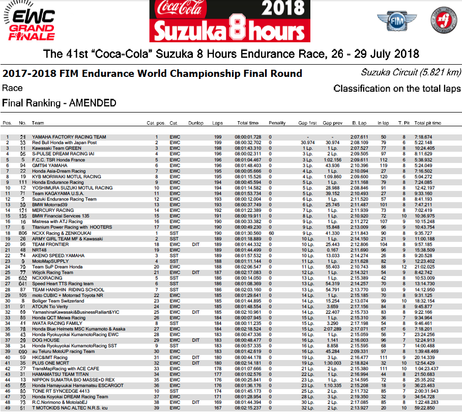 A Suzuki S-Pulse Dream Racing IAI (Hideyuki Ogata, Tom Bridewell e Kasuki Watanabe) realizou uma corrida perfeita para no final terminarem muito perto de um pódio totalmente japonês com a Yamaha, Honda e Kawasaki nos primeiros lugares.
