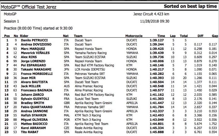Até ao momento 23 pilotos já estiveram em pista, numa tabela que é liderada pela Ducati. Danilo Petrucci e Andrea Dovizioso ocupam a primeira e segunda posições, respetivamente. O ‘melhor dos outros’ é Marc Márquez em terceiro. De referir ainda que Valentino Rossi não rodou, sendo que Joan Mir é para já o melhor estreante em 10º