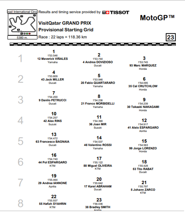 O português Miguel Oliveira vai começar a sua primeira corrida de MotoGP, de facto a primeira de qualquer português, de 17º na sexta fila da grelha no Qatar, depois de se qualificar em 7º da sua sessão cronometrada.