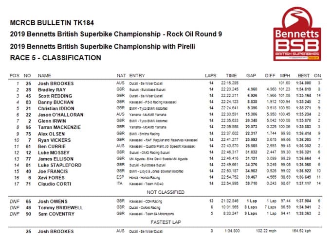 Josh Brookes conquistou a sua sétima vitória de Superbike de 2019 para aumentar a sua liderança no topo da classificação, enquanto o quarto lugar de Danny Buchan vê o piloto da FS-3 Racing Kawasaki garantir o seu lugar no Desafio Final.