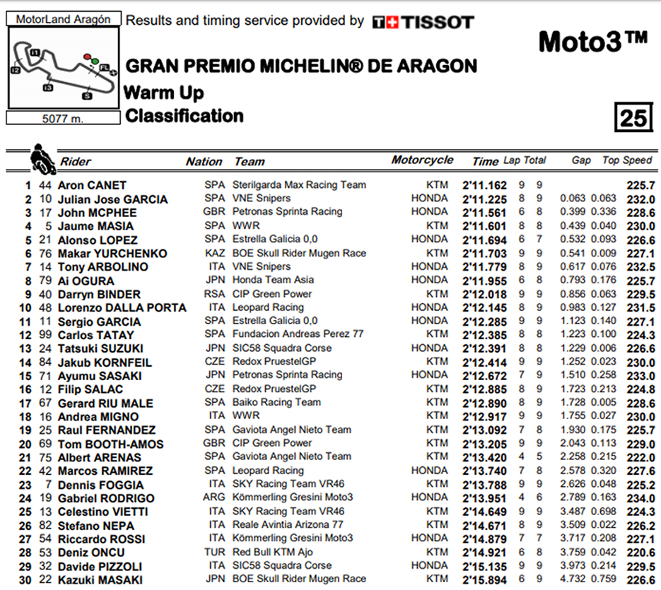 Embalado pelos bons resultados de ontem, Aron Canet da KTM Sterilgarda Max foi o mais rápido, com um tempo de 2:11.162.