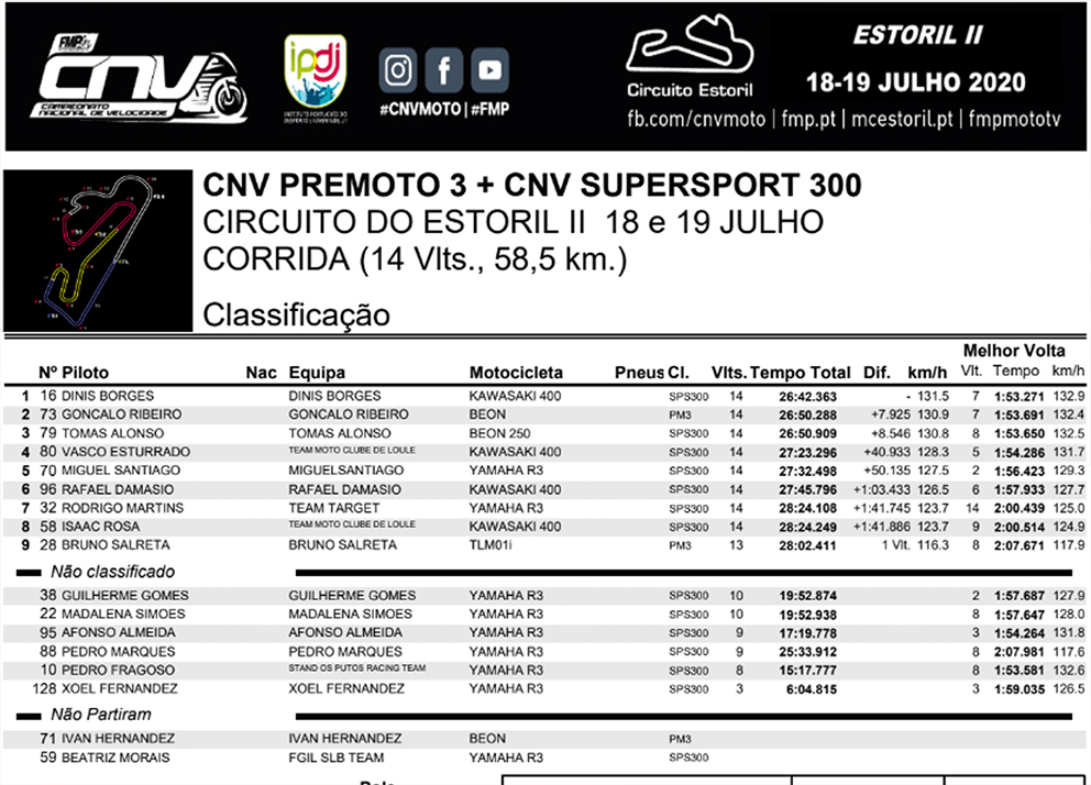 Porém, nas SSP300, Dinis Borges teve de assegurar a vitória na classe de Supersport 300 na sua Kawasaki sobre a similar de Tomás Alonso, em terceiro, com Vasco Esturrado em 4º, após a desistência de Pedro Fragoso a 1 volta do fim.