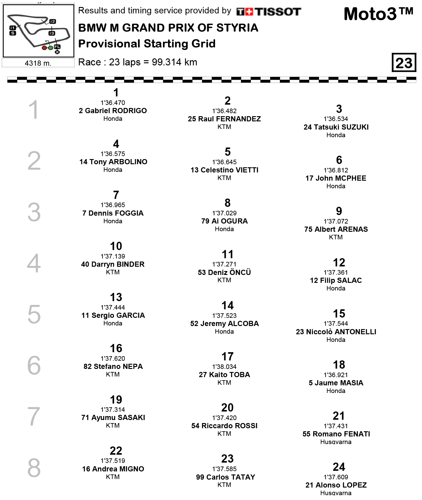 Com os intermédios rápidos a aparecerem acesos na tabela em rápida sucessão, Gabriel Rodrigo foi para a frente, mas estavam vários pilotos em posição de contrariar o seu tempo rápido, embora no final não conseguissem bater io tempo do Argentino, com Fernández a acabar a apenas 12 milésimas e Suzuki a completar a primeira fila…