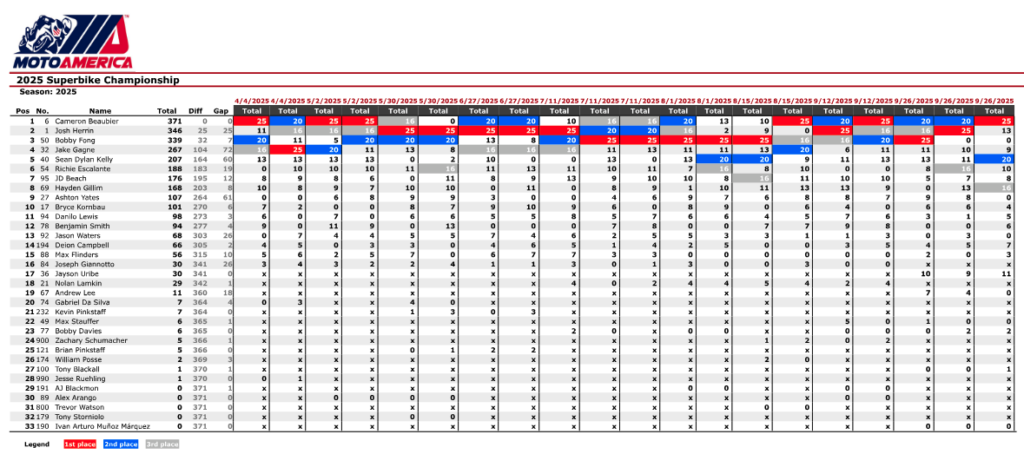 A classificação final do Campeonato vê Beaubier na liderança com 371 pontos, mais 25 do que os 346 de Herrin e mais 32 do que os 339 de Fong. Gagne e Kelly completaram o top 5, com Escalante, Beach, Gillim, Yates e Kornbau a completarem o top 10. A vir às SBK no Estoril, Fong já não virá como Campeão.