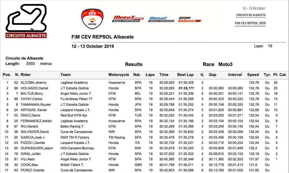 Na verdade, Daniel Holgado viria a fazer a volta mais rápida a perseguir o vencedor em 1:35.171, com o grupo a permanacer muito próximo até à linha da meta, mas Alcoba tinha as coisas controladas na Husqvarna da Laglisse Academy e venceria por 0,060 milésimas de vantagem sobre a carga de Holgado, com a ordem dos seguintes a permanecer até Artigas, que veio detrás ultrapassar Öncü para 6º …