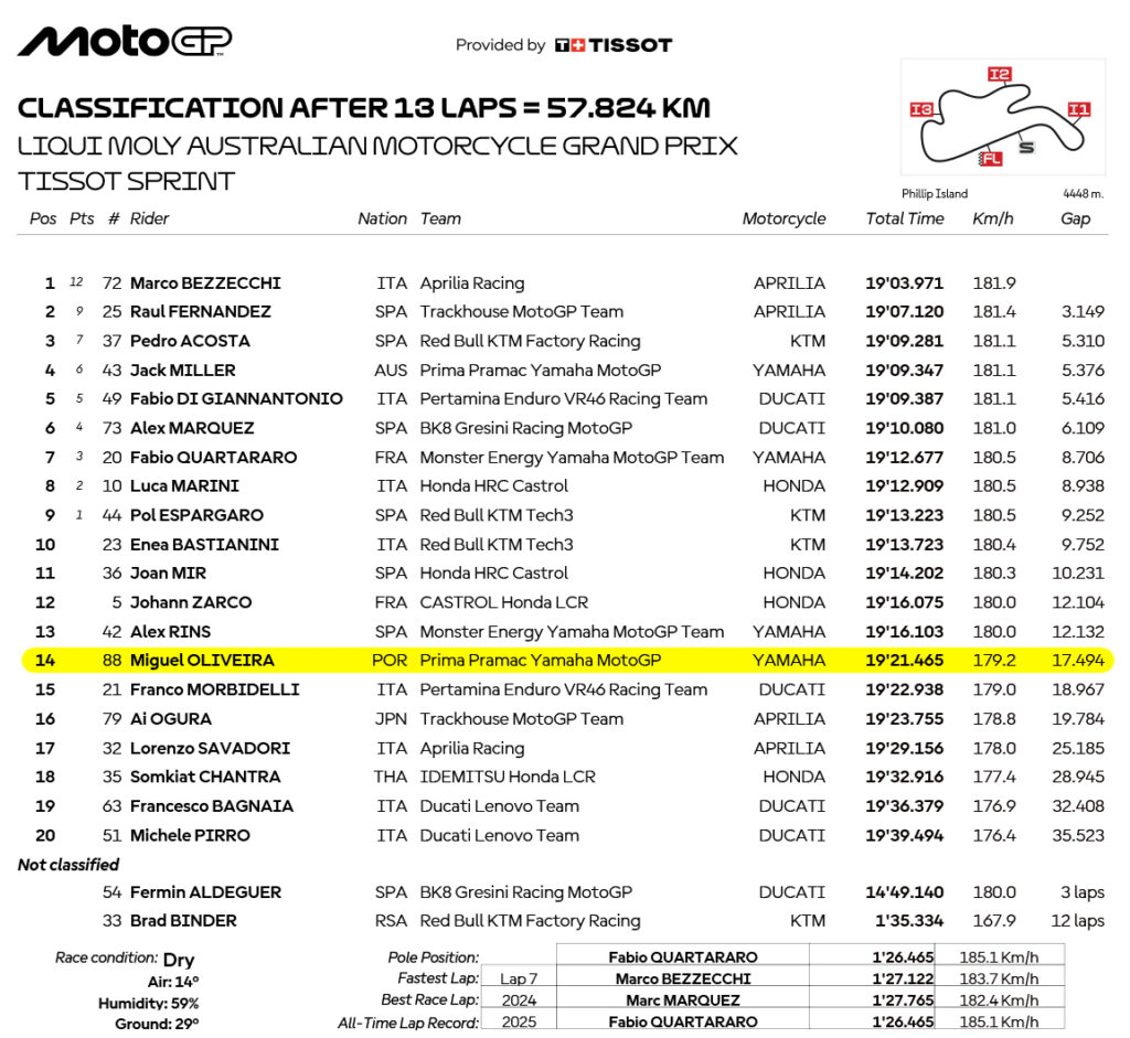 Partindo da 6ª fila da grelha, Oliveira pouco podia fazer para além de tratar a corrida como um treino de luxo. No evento, mostrou a sua garra passando Bezzecchi logo de início, e com a queda de Binder, já tinha subido dois lugares, mas estava agora a uma distância considerável, mais de 2 segundos, do 13º de Johann Zarco.