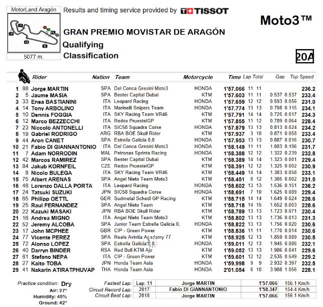 Jorge Martin conquistou a pole position para o Grande Prémio de Aragão. O piloto espanhol conseguiu a sua nona pole position este ano, ao ser muito mais rápido do que toda a concorrência na qualificação. Martin foi 0.537s mais rápido do que Jaume Masia, que vai arrancar de segundo – igualando o seu melhor resultado de sempre em qualificações -, com Enea Bastianini a ser o terceiro mais rápido.