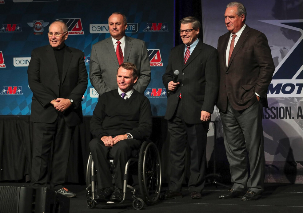 Um nome que chamou imediatamente a atenção foi o de Wayne Rainey, tricampeão do mundo de 500cc e a principal figura por detrás da MotoAmerica. Rainey, juntamente com o seu Grupo KRAVE, que inclui também Chuck Aksland, (de pé acima de Rainey) Richard Varner (direita) e Terry Carges (esquerda), é agora alegadamente um consultor externo de alto nível da Liberty Media.