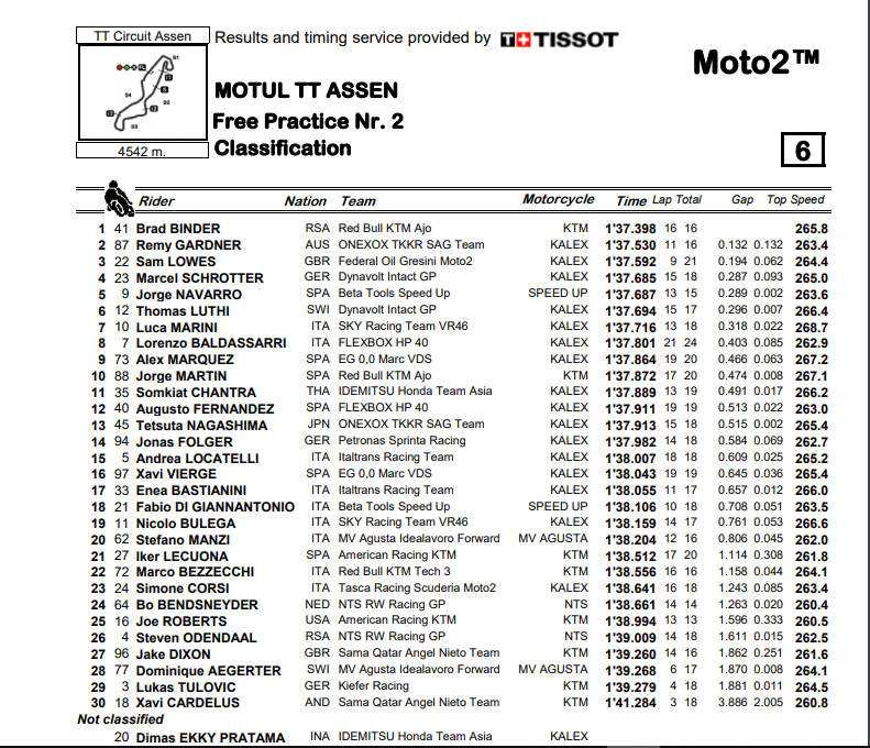Brad Binder, que até estava fora do Top 10, começou a aparecer nos últimos minutos da sessão, e acabou por saltar para a frente com 1:37.398, deixando os outros sem resposta, e Baldassarri, Marquez e Martin, na segunda KTM Red Bull, a fechar o Top 10.