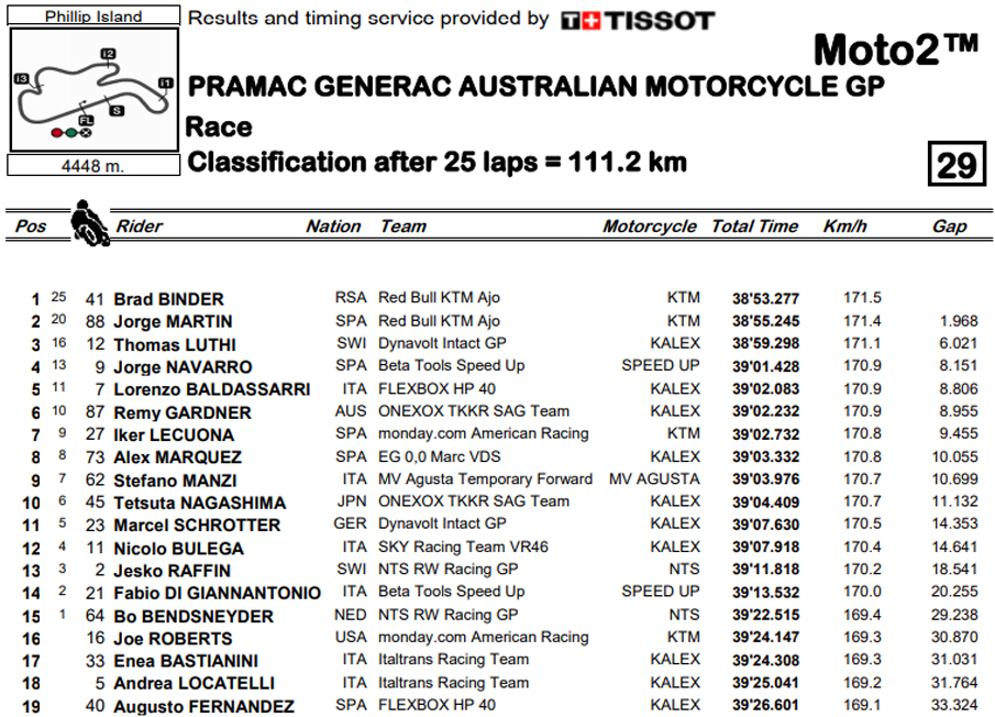 A 10 voltas do fim, Aegerter e Chantra eliminam-se mutuamente, e Binder e Martin continuam um recital colados à frente, o Sul-africano entrando com a traseira de lado nas curvas mais lentas do traçado mas o rookie atrás dele a aguentar o ritmo e manter Lüthi à distância.