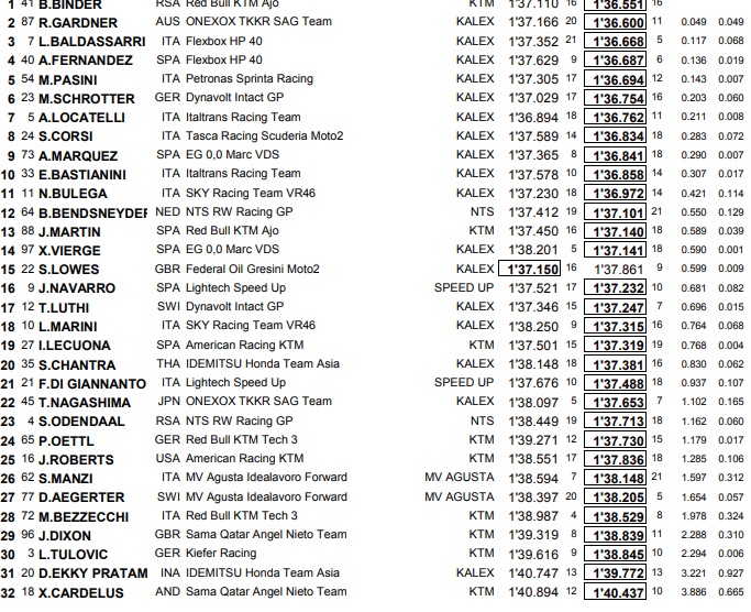 Já Nicolò Bulega voltou a ser o melhor estreante, no 11º lugar, naquele que, até ao momento, está a ser o seu melhor fim de semana em Moto2. Por sua vez Luca Marini e Thomas Lüthi desiludiram ao ficarem em 18º e 17º, respetivamente.