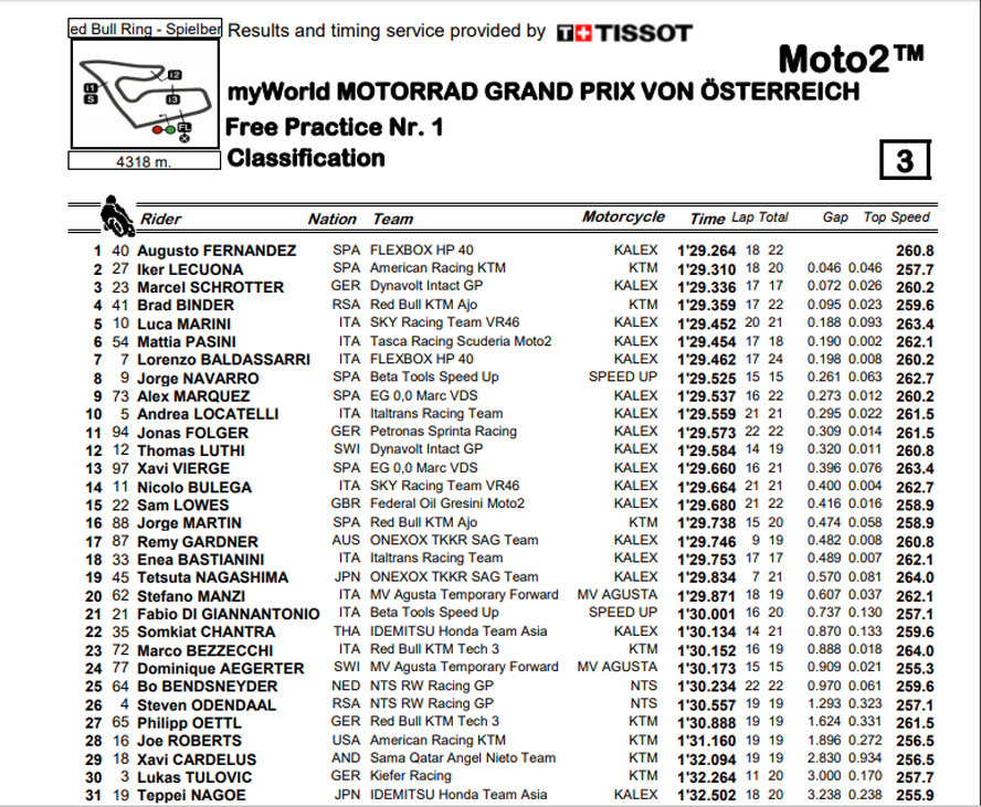 À bandeira, por uma vez Márquez ficaria apenas 9º com Navarro a aparecer em 8º, e o tempo de Fernandez a permanecer o mais rápido, Folger e Luthi já fora do Top 10…