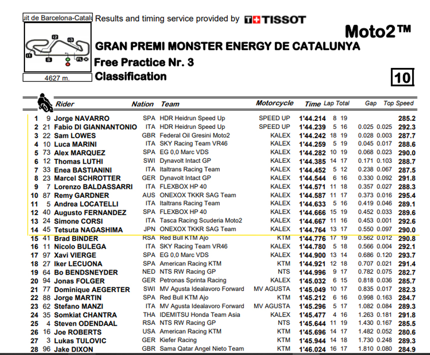 A luta pelos tempos rápidos era toda entre Marini, Luthi e Márquez, sem conseguir igualar o crono de Navarro, mas logo a seguir estavam Bastianini, Schrotter, Locatelli, Corsi e Lowes, que saltava para 5º, pelo que tudo podia acontecer.
