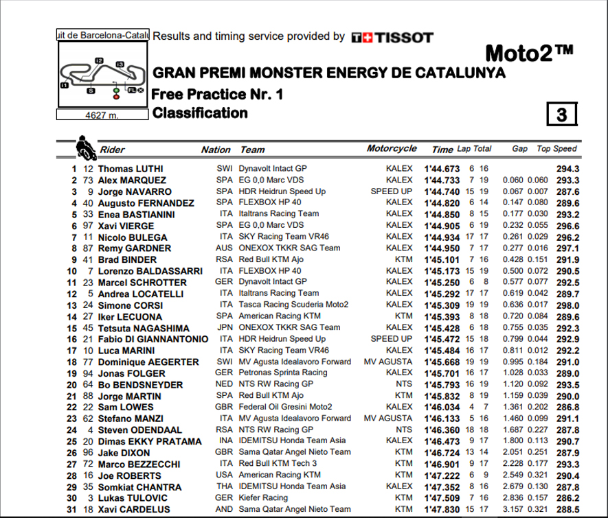 Por volta dos 10 minutos do final da sessão, como habitual, muitos pilotos vieram à boxe trocar de pneus, Baldassarri ficou em pista a atacar os tempos, mas aparte Navarro acabar 3º., nada se alterou e Luthi cortou a bandeirada à frente seguido de Márquez.