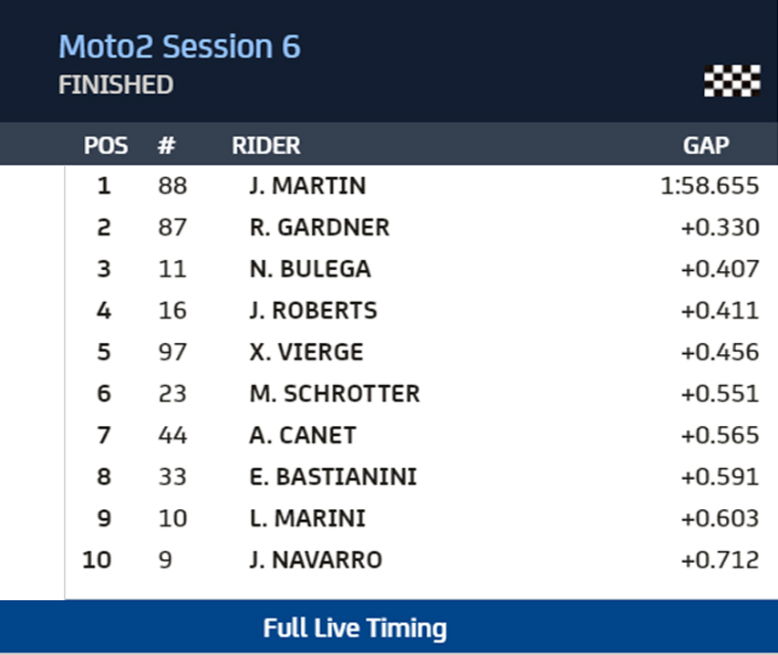 Os outros, por ordem, foram Bulega, Roberts, Vierge, Schrotter, Canet e Bastianini, com Luca Marini e Jorge Navarro, que ficara à frente no primeiro dia, a completar o Top 10.