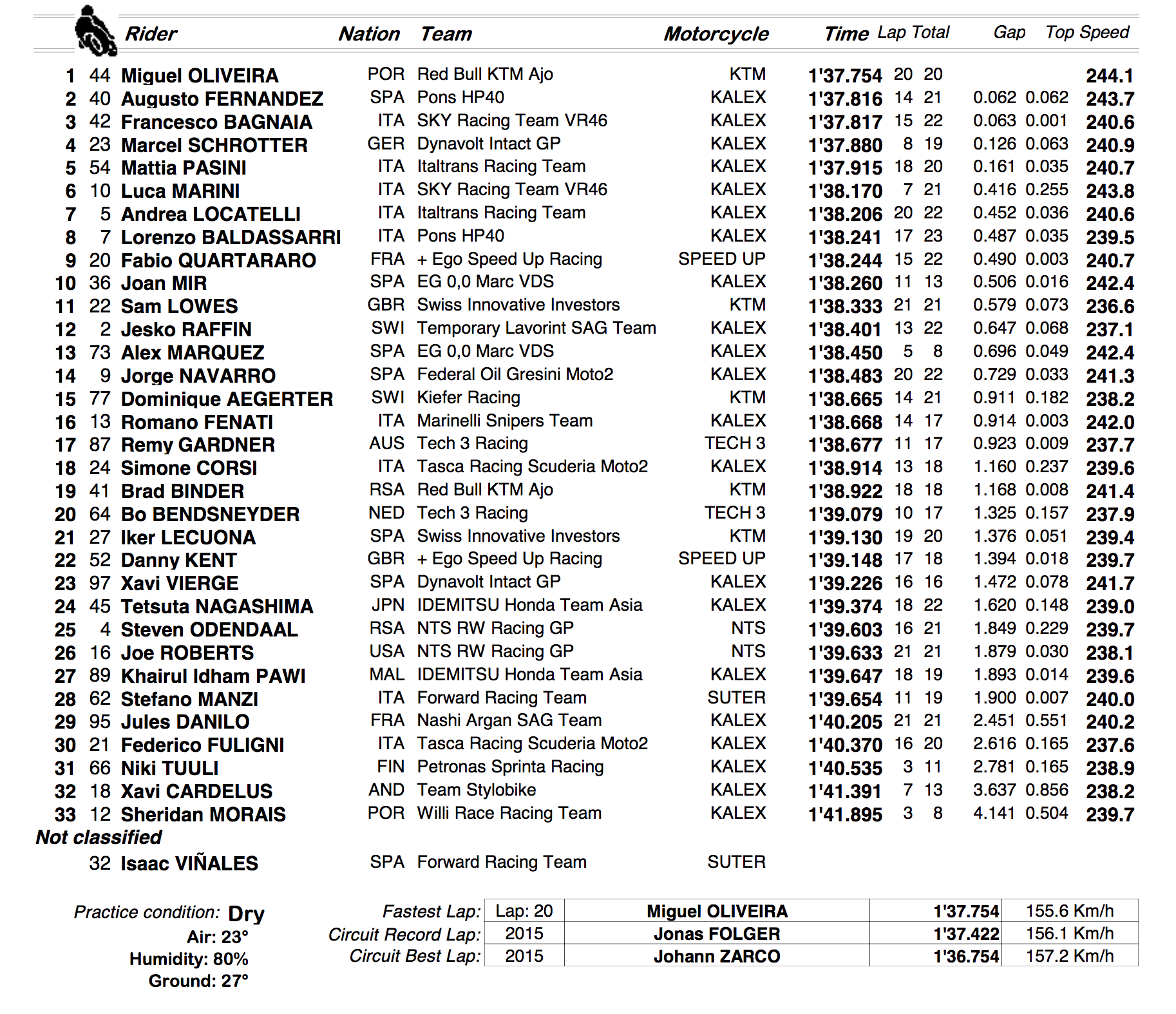 Miguel Oliveira termina as sessões de treinos livres do Grande Prémio de São Marino e da Riviera de Rimini em primeiro lugar. O piloto português conseguiu o tempo mais rápido na sua última volta, já no final de sessão, e conseguiu também o tempo mais rápido até agora no Moto 2. Este resultado do piloto português deixa-nos com boas perspectivas numa boa qualificação para a corrida de amanhã.
