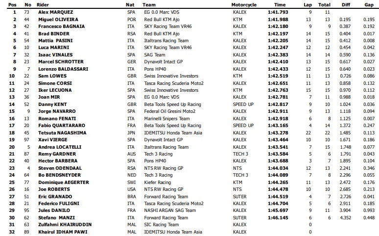 Mattia Pasini, com sua rapidez habitual, foi quinto, numa sessão onde Isaac Viñales foi um surpreendente sétimo, enquanto Lorenzo Baldassarri e Sam Lowes não foram além da 9ª e 10ª posições, respetivamente.