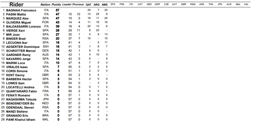No sua perseguição está o anterior líder, Mattia Pasini, bem como Álex Márquez, pilotos que estão a 10 pontos do comando. Nota ainda para Lorenzo Baldassarri, que teve um fim de semana duro em Austin, piloto que fecha o top cinco a 18 pontos do compatriota Bagnaia. Mais para trás estão já Xavi Vierge, que desistiu na última corrida, e o estreante Joan Mir que tem dado muito boa conta de si nesta primeira abordagem ao Moto2.