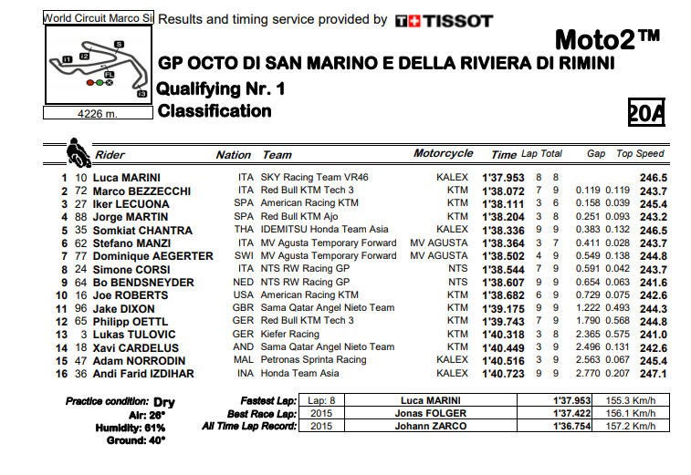 Iker Lecuona, Marco Bezzecchi, Jorge Martin e Stefano Manzi foram os primeiros a ocupar os quatro lugares disponíveis na Q2. Somkiat Chantra ainda tentou colocar-se entre os quatro primeiros mas sem sucesso, acabando por ficar mesmo à porta da segunda sessão de qualificação.