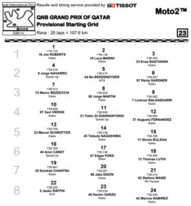 Um pouco atrás, Gardner carregava até ao 5º lugar, que o colocaria ao lado de Baldassarri na segunda fila, com DiGiannantonio, (Speed Up Beta) Vierge (Petronas Sprinta) e Bezzecchi (Sky VR46) a completar o Top 10 e Luthi e Martin ainda a tentar fazer a diferença.
