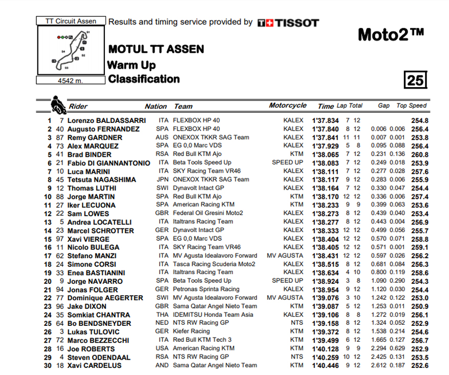 Armados com a estatística de que o piloto saído da pole tem sido também o vencedor em Moto2 em Assen, o Warm Up da classe intermédia produziu muita ação e alguns factos interessantes: