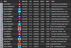 Manuel Gonzalez, que bateu o recorde anterior da pista por quase um segundo na qualificação, estabeleceu o primeiro melhor tempo no Q2. Na primeira tentativa, o espanhol foi significativamente mais rápido, mas a volta do líder foi cancelada quando a sessão foi interrompida por bandeiras amarelas devido à queda do turco Deniz Öncü. Enquanto isso, o veterano da Moto2, Aron Canet, assumiu a liderança, à frente de Senna Agius e do campeão da Moto3, David Alonso. À espreita: Izan Guevara, Dani Holgado e o herói britânico, Jake Dixon.
