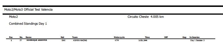 Um momento que, apesar das difíceis condições meteorológicas, terá gerado enorme satisfação junto de toda a equipa, pois a Kiefer Racing e o próprio Aegerter estiveram muito perto de não poder estar presentes nesta nova época. O piloto helvético completou um total de 26 voltas e teve como melhor registo 1m51.344s, que naturalmente fica muito longe daquilo que os protótipos de Moto2 fazem nesta mesma pista quando o piso está seco.