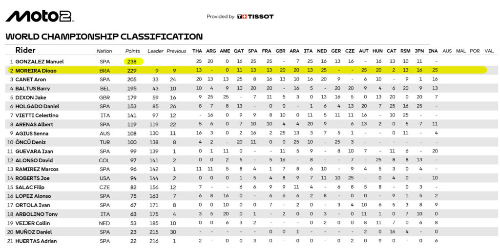 O líder do Campeonato do Mundo foi posteriormente desclassificado e teve de voltar a casa com zero pontos. A diferença entre González e Moreira baixou para 9 pontos, enquanto Aron Canet, que herdou o terceiro lugar na Indonésia, está agora a 33 pontos do líder.