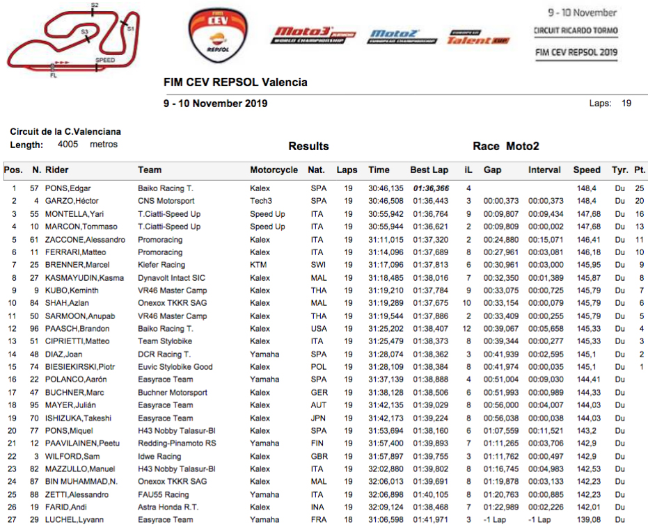 Com Garzo a recuperar a frente de novo, só na última volta da corrida voltaria Pons a liderar para vencer após numerosas voltas colados em batalha, o último degrau do pódio decidido por uma manobra agressiva de Marcon, vencendo por 2 milésimas sobre o seu próprio colega de equipa Montella só para ser penalizado a seguir, ficando mesmo em 4º.