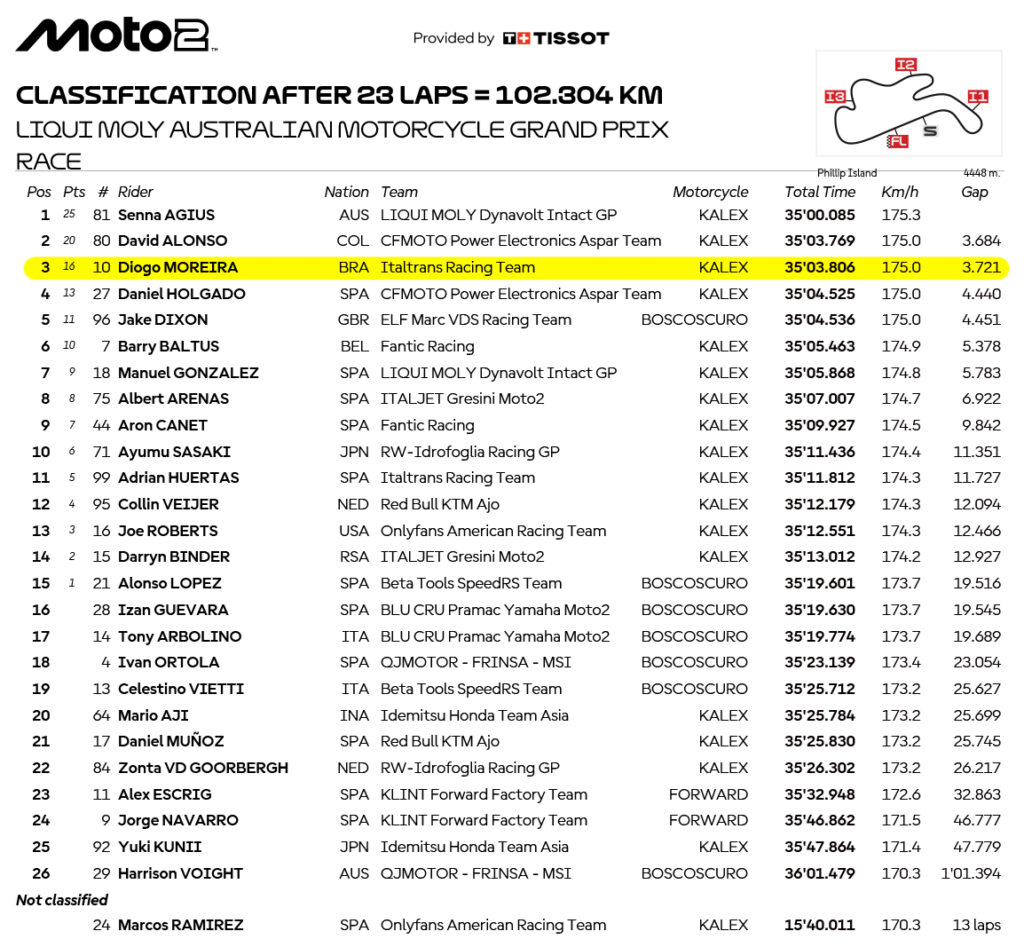 Agius viria vencer por 5 segundos, e com González apenas 6º, Moreira tenta tudo para passar Alonso, mas o piloto da CF Moto defende e é Baltus a vir detrás para passar também González, deixando Moreira a 2 pontos de González antes da Malásia…