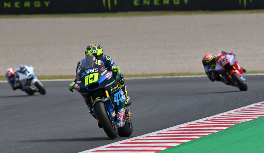 Moreira pressionava Alonso, mas este salta para 2º na volta 8, levando o brasileiro a passar também para 3º, as motos negras da Dynavolt agora separadas com ‘Manu’ em 4º e Sasaki 5º.