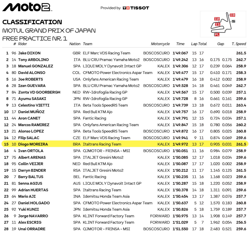 Se Jake Dixon não foi uma surpresa ao liderar o FP1 no Japão na Boscoscuro da Marc VDS, já o segundo classificado Arbolino levantou algumas cabeças, batendo o líder do Campeonato Manu González para 3º apesar de estar ele próprio apenas em 17º na pontuação.