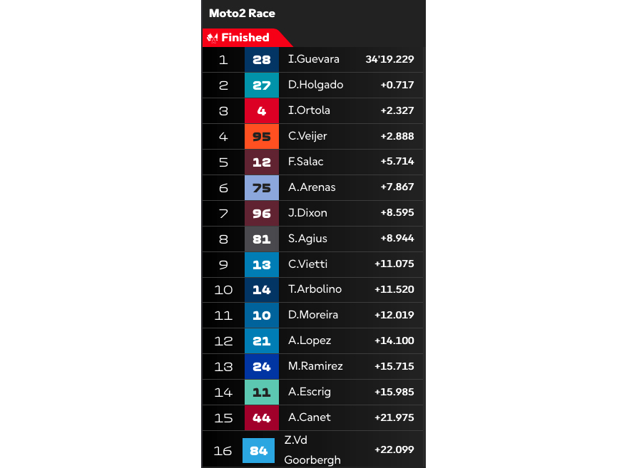 O brasileiro viria acabar num prudente 11º, passado por Dixon, Vietti e Arbolino, já a antecipar a celebração dum título que o verá ascender à MotoGP em 2026.