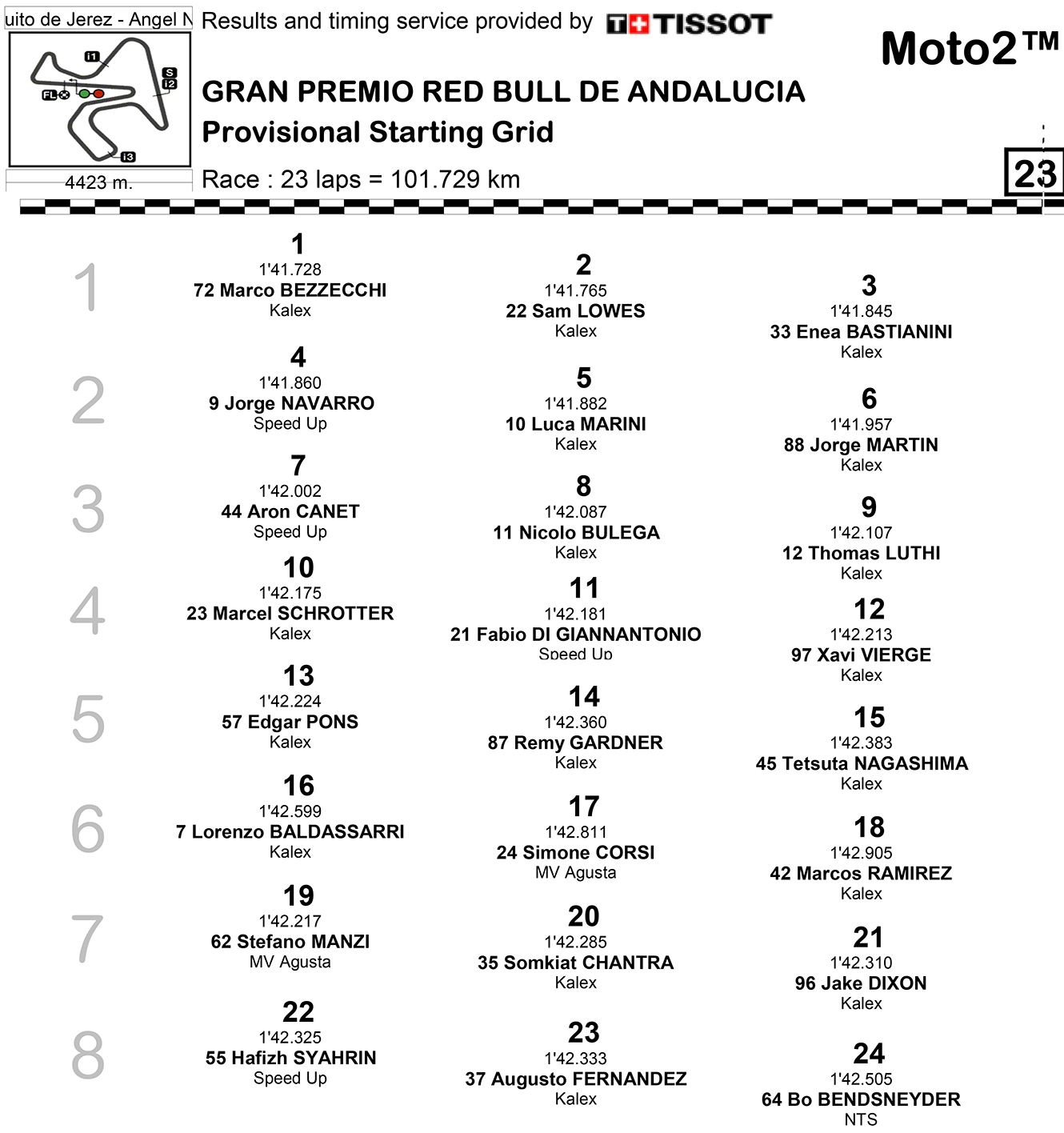 Nicolo Bulega parecia estar de volta à sua antiga forma, enquanto lutava até ao oitavo lugar pela Gresini. Atrás dele estão o par da GP Liqui Moly Intact de Tom Luthi em nono e Marcel Schrotter em décimo. O alemão tem lutado para encontrar forma desde que bateu o recorde da volta de Jerez no fim de semana passado.