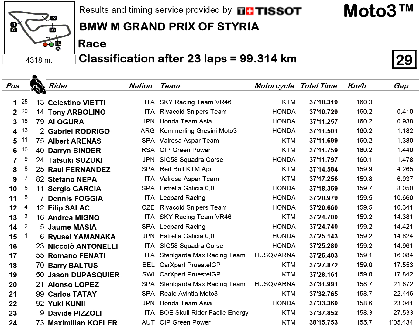 Vietti e Ogura trocam de lugares na liderança e Arenas é atacado por Rodrigo, e é 6º outra vez, só com Binder atrás no grupo da frente, pondo em dúvida o pódio… mas as coisas são facilitadas quando McPhee cai a 2 voltas do final e Vietti lidera na última volta, para vencer pela primeira vez…