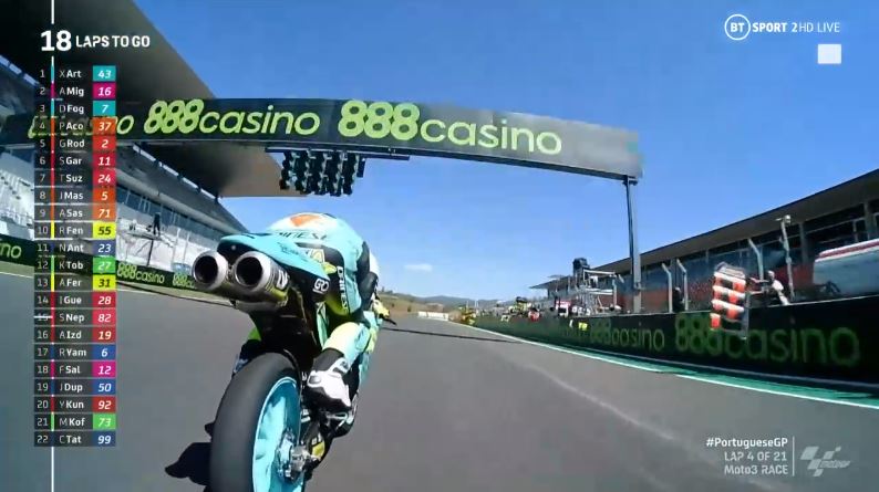 Após seis voltas Dennis Foggia é o líder de uma corrida de Moto3 animada com um grupo de cerca de dez pilotos a disputar o primeiro lugar. Gabriel Rodrigo foi obrigado a cumprir uma Long Lap por derrubar Xavier Artigas, Pedro Acosta, Sergio Garcia e Andrea Migno seguem no encalce da Honda Leopard de Foggia…