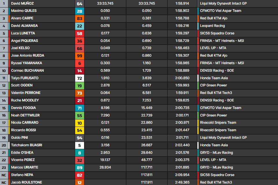 Na última volta, Rueda, que vinha em quinto, cometeu um erro e caiu para a oitava posição. Nos metros finais, os espanhóis David Munoz e Máximo Quiles mostraram a maior garra. Os pilotos da KTM lutaram até a linha de chegada, com Munoz a vencer. O companheiro de equipa de Rueda, Álvaro Carpe, assumiu a liderança sobre o estreante Quiles por 0,050 segundos.