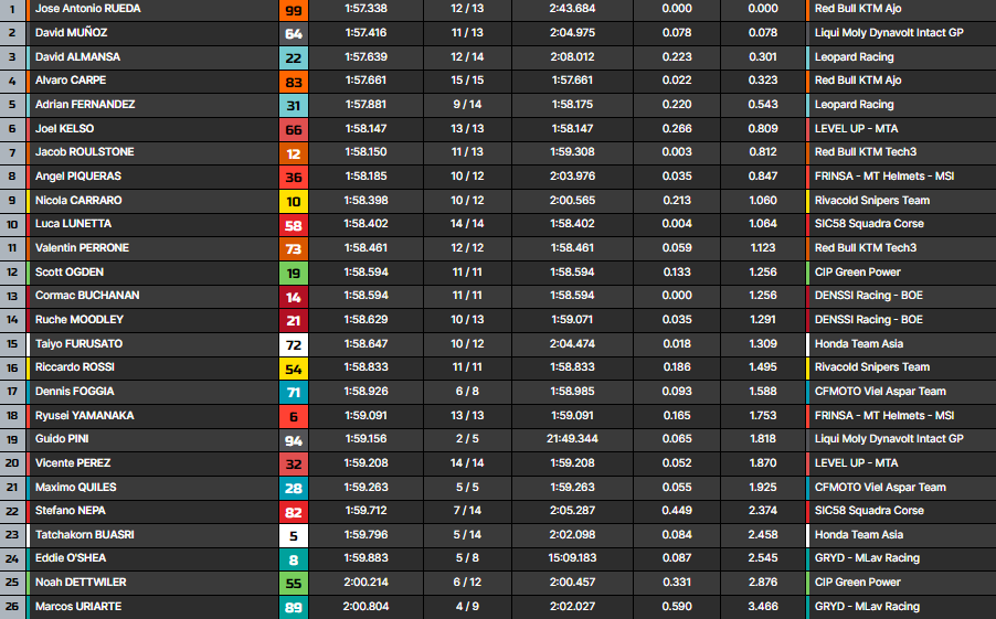 David Almansa está a uma distância maior, a três décimos do topo, seguido por Álvaro Carpe, que se redimiu da sessão da manhã. Ao contrário de Guido Pini, que após uma excelente manhã, não atingiu o objetivo de ficar entre os 14 primeiros nesta sessão. Décimo nono tempo, pelo que amanhã o veremos no Q1. Com ele, outros três italianos: Riccardo Rossi (16º), Dennis Foggia (17º) e Stefano Nepa (22º).
