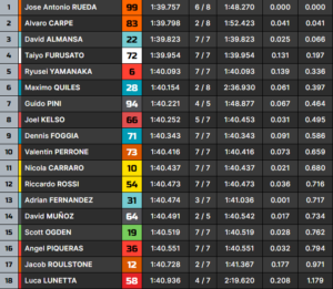 Após duas voltas, Carpe estabeleceu o primeiro melhor tempo notável com um tempo de 1:39.798 min, colocando-se mais de três décimos de segundo à frente de David Almansa, Quiles e do jovem Guido Pini. Na segunda parte da sessão, José Rueda assumiu a liderança com o tempo de 1:39.757 minutos; ninguém mais conseguiu igualar o tempo do líder do Campeonato do Mundo. O espanhol largará da pole position pela quinta vez no Grande Prémio de domingo, acompanhado pelo seu companheiro de equipa na Red Bull KTM, Carpe, e pelo piloto mais rápido da Honda, David Almansa.