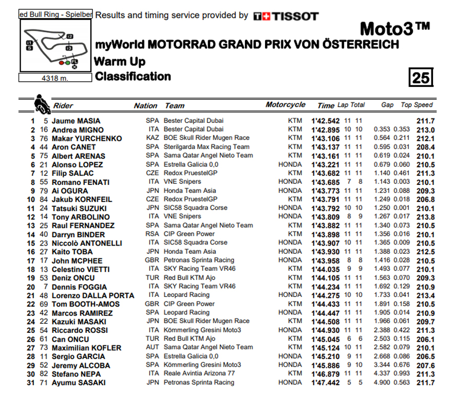 Jaume Masia (Bester Capital Dubai) liderou as tabelas de tempos no warm up das Moto3 com o seu 1:42.542 na última volta a deixar a 0.353 o companheiro de equipa Andrea Migno, e Makar Yurchenko (BOE Skull Mugen Race) a completar os três primeiros.