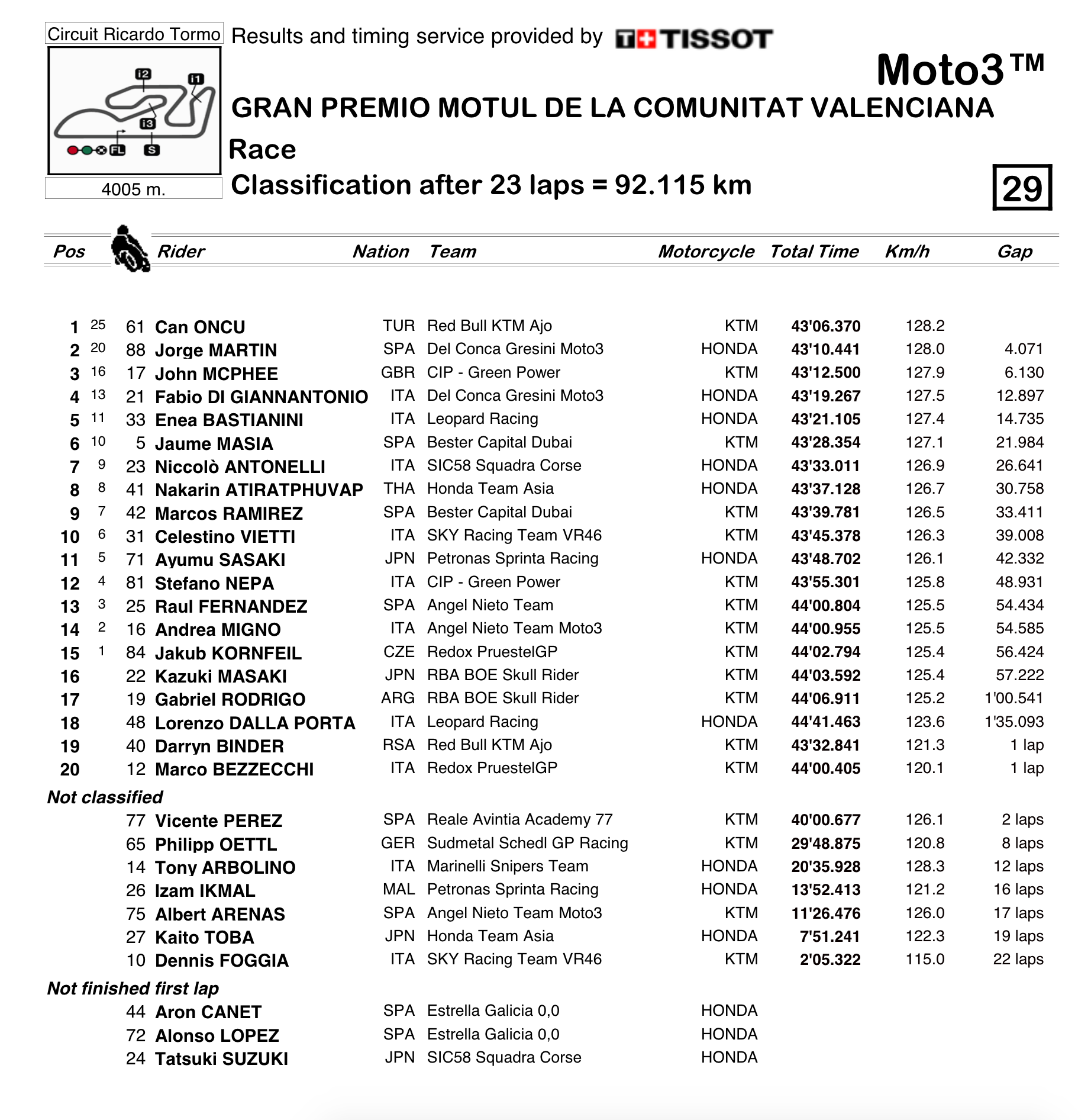 Oncu era segundo, também confortavelmente, e só teve de continuar a sua corrida com calma, algo que a sua boxe relembrava a cada passagem pela meta. Oncu terminou com 4.071s de vantagem para Jorge Martin, mas a vantagem chegou a passar dos oito segundos.
