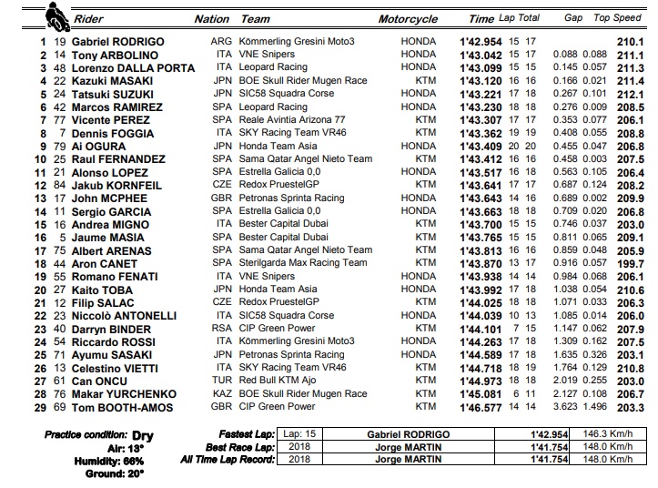 Nesta primeira sessão o mais veloz foi Gabriel Rodrigo com o tempo de 1m42.954s, tendo sido o único piloto a entrar no segundo 42. Seguiu-se, a apenas 88 milésimos, Tony Arbolino. O terceiro lugar ficou para Lorenzo Dalla Porta, que foi um dos quatro pilotos que não evitou uma queda na Curva 3. Os restantes três foram John McPhee, Makar Yurchenko e Niccolò Antonelli.