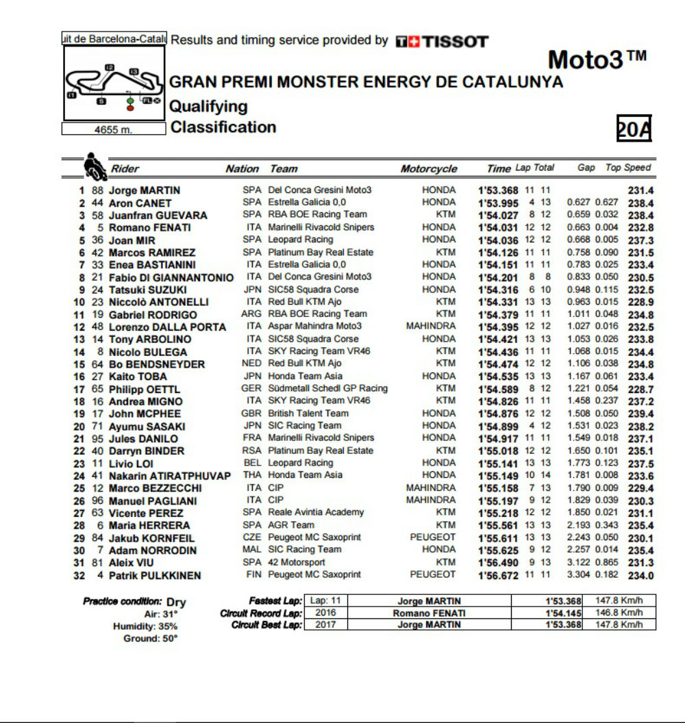 O piloto espanhol, foi o último a sair para a pista a três minutos do final da qualificação e em apenas uma volta lançada realizou o melhor tempo ao rodar em 1m53,368s, o que constitui um novo recorde da pole position de Moto3 no circuito da Catalunha.
