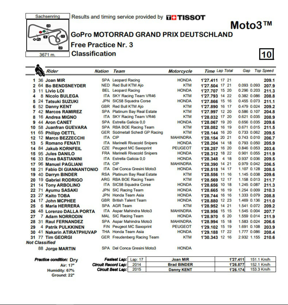 A terceira e última sessão de treinos livres de Moto3 para o GP da Alemanha, que terá lugar amanhã no circuito de Sachsenring, ficou marcada pelo domínio do líder do mundial.